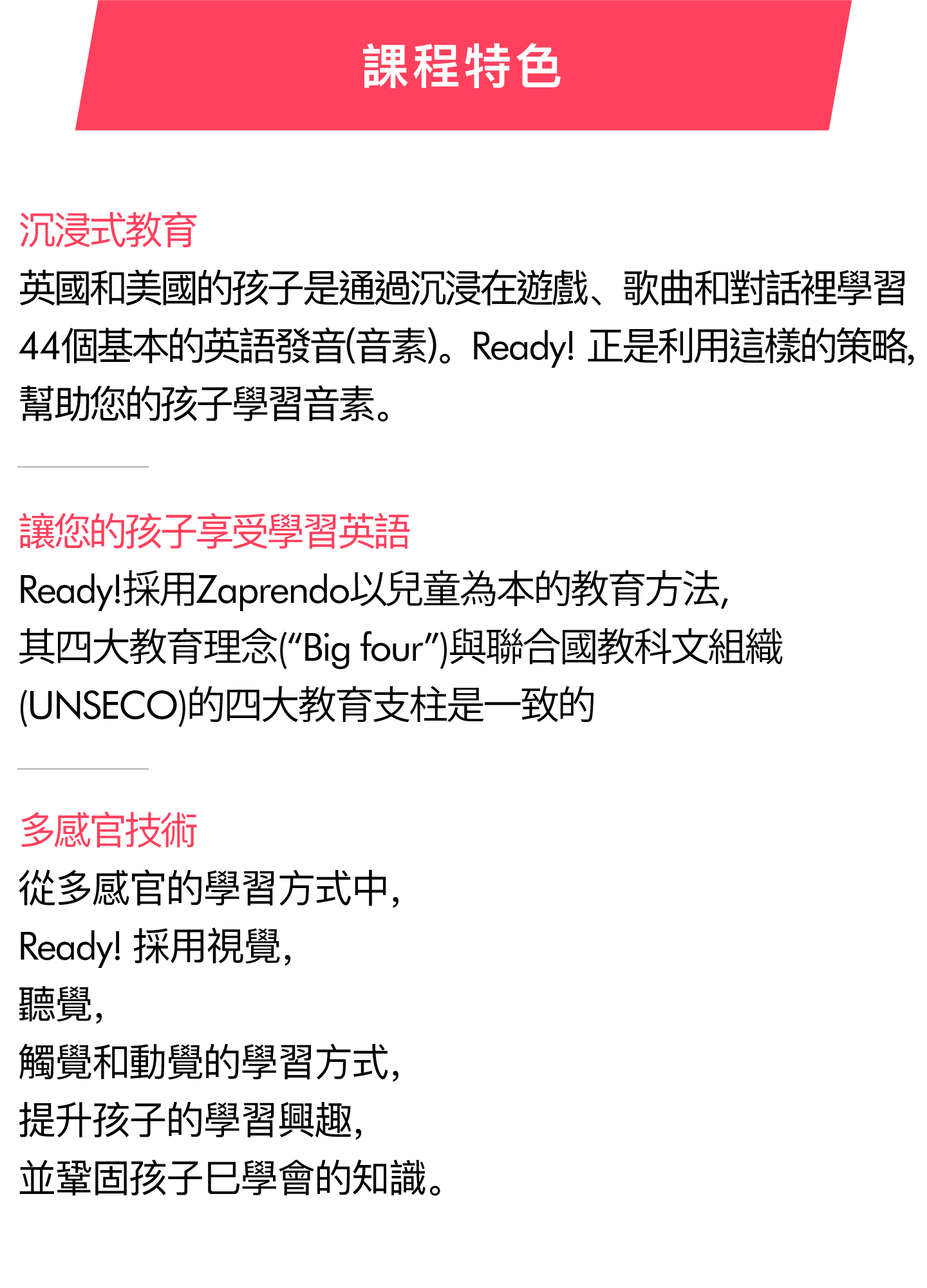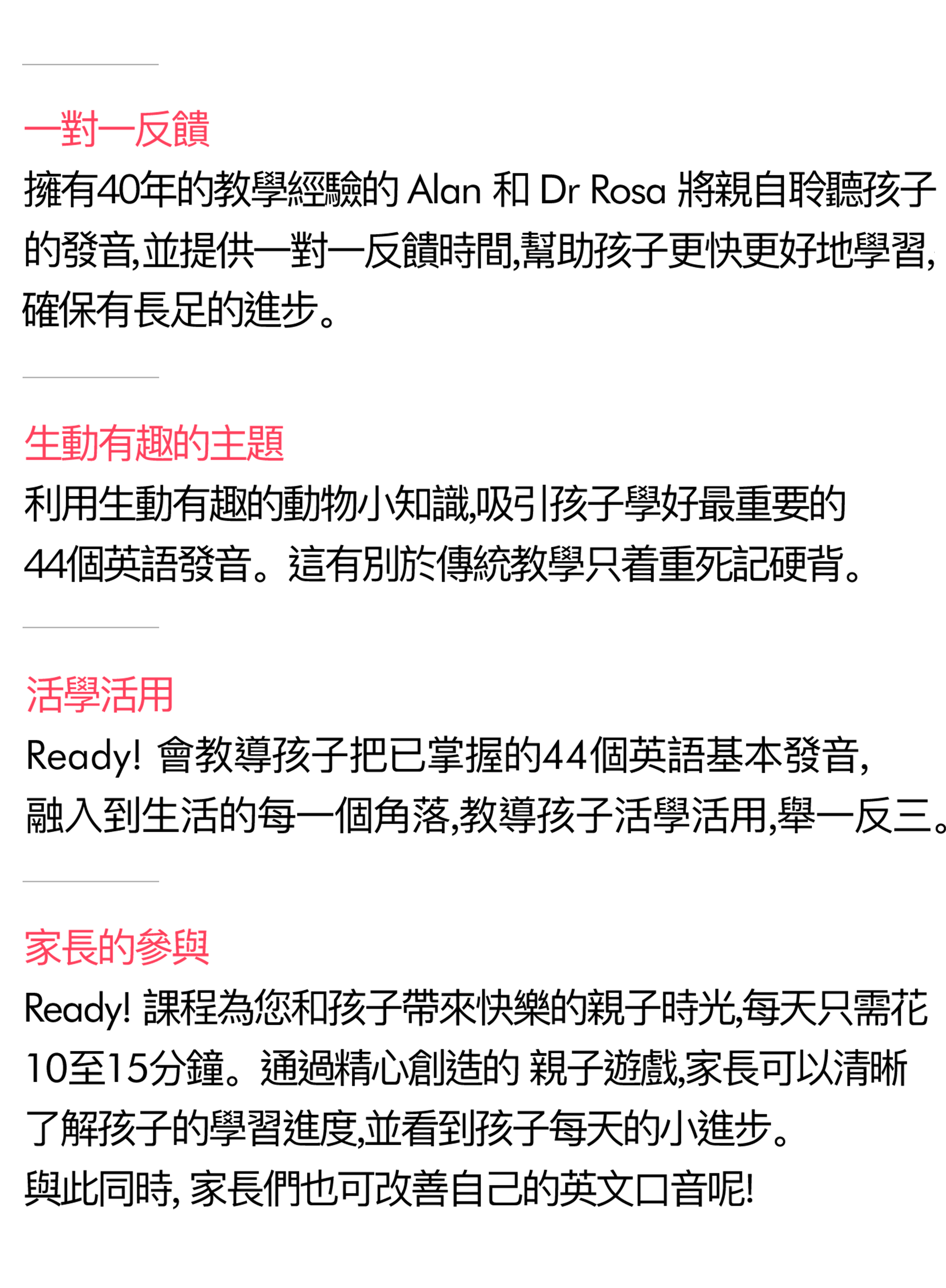 Ready! 課程會以華語(普通話)和英文授課,讓孩子學習英文中最重要的44個音素。